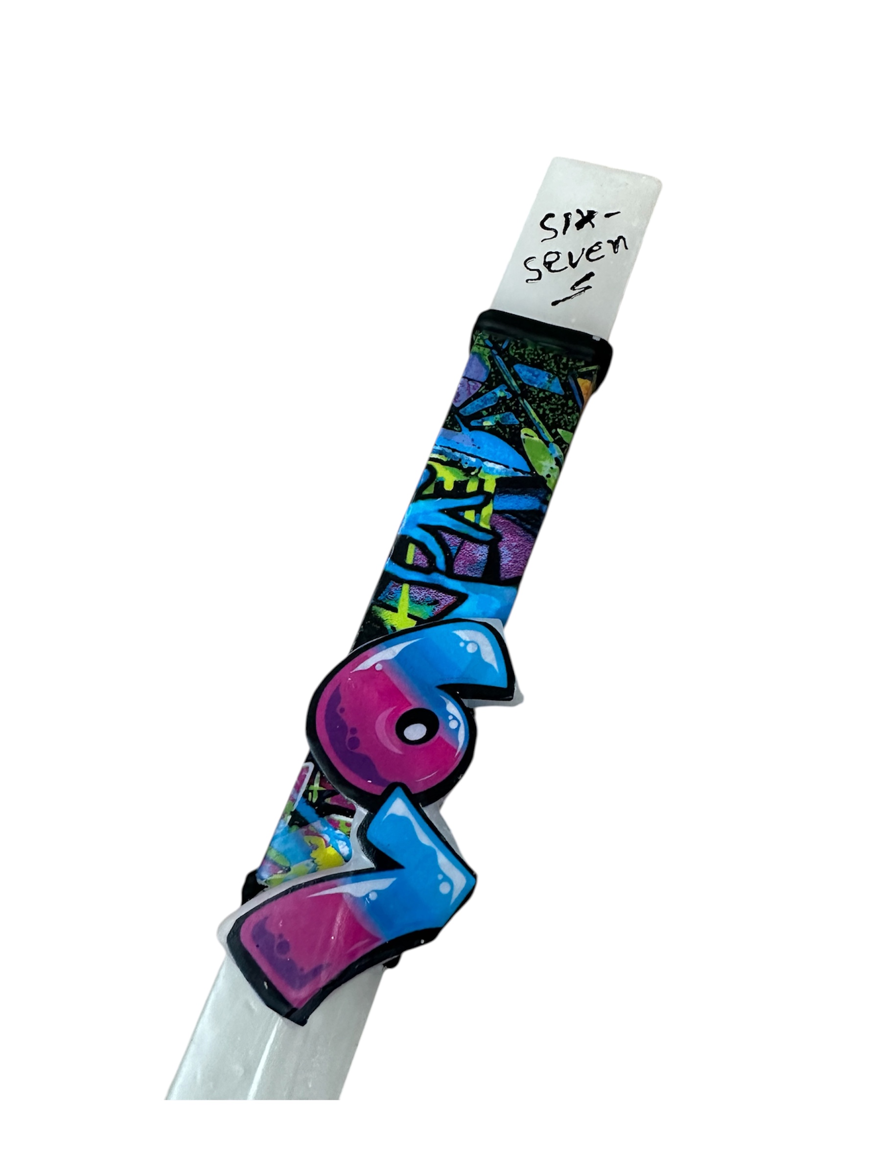 1 λαμπάδα με διακοσμητική επένδυση με πολύχρωμο graffiti και ανάγλυφους αριθμούς 6 και 7.