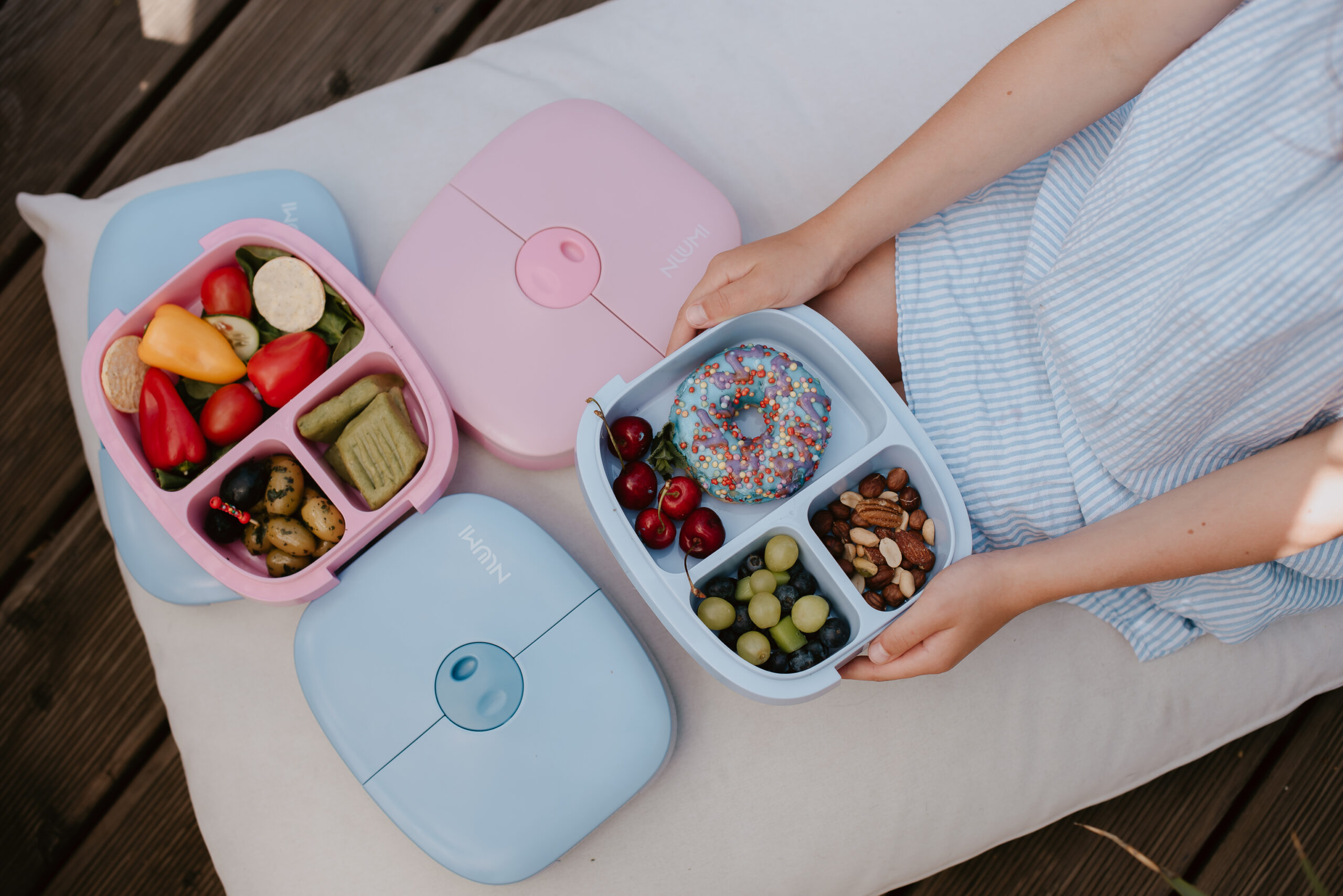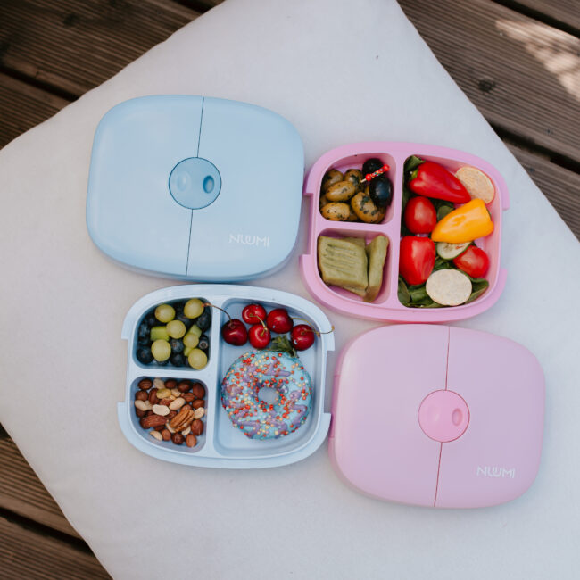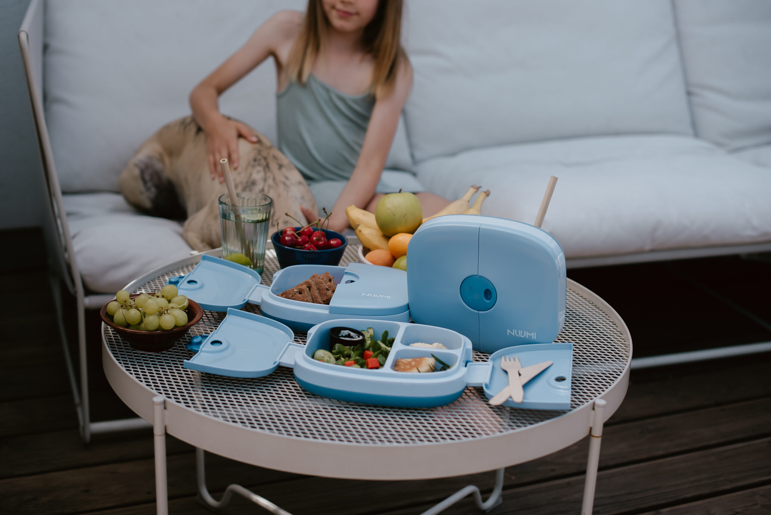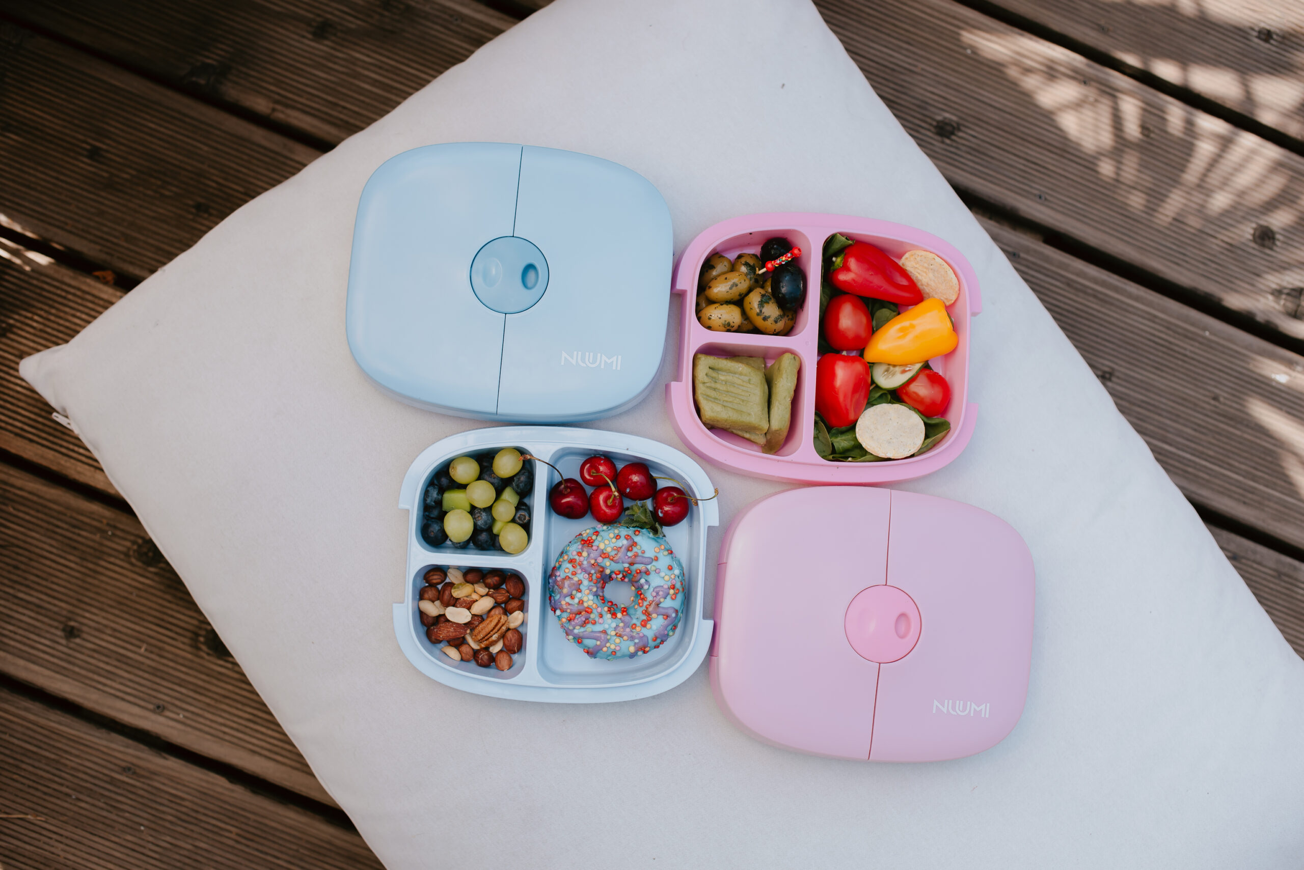 Το παιδικό μεσημεριανό κουτί Nuumi αποτελείται από τρία μέρη: ένα μπολ, ένα εσωτερικό καπάκι και μια θήκη που κλείνει με ένα κουμπί.